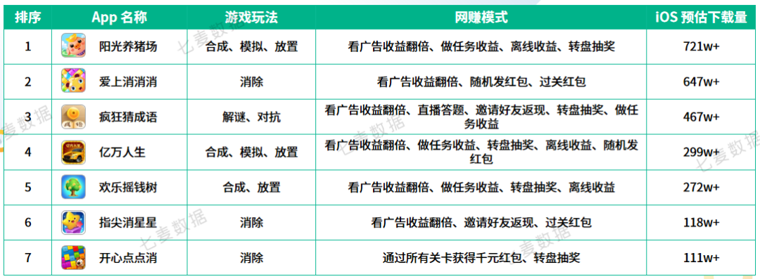 有 7 款产品在游戏玩法中,融入了网赚模式,主要以看广告收益翻倍、做任务得收益、过关红包、离线收益为主。