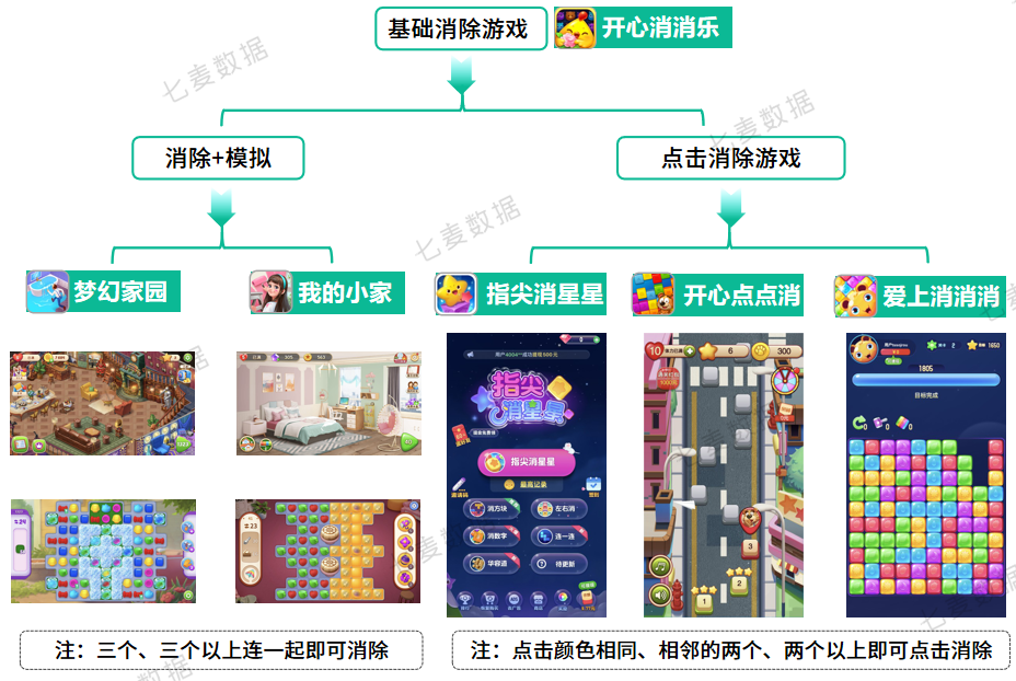 开心消消乐是 2014 年上架的经典消除游戏,游戏主线和副线均是以消除游戏为主。此后,出现了以消除游戏为主的模拟搭建游戏,国外厂商推出梦幻家园,是让用户通过游戏获得的星星,兑换搭建房屋、装修家园的材料;蓝飞互娱推出我的小家,在消除、模拟的基础上,还增加女性职场剧情,提高用户游戏代入感。近年来,由三个或三个以上连在一起即可消除的玩法,开始演变成颜色相同又相邻的两个或两个以上的,点击即可消除。