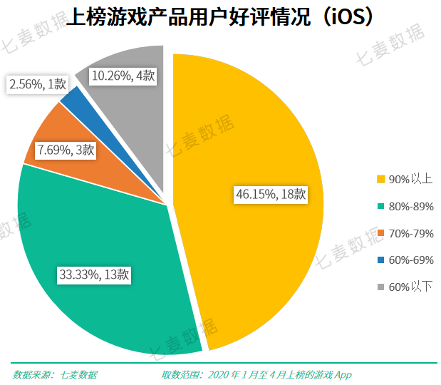 从这 39 款产品用户好评情况来看,整体好评较高,46.15% App 好评度在 90%以上,33.33% App 好评度在 80% * 89%期间,但也有 10.26% 的产品好评度不及格,产品遭受差评的主要原因集中于:广告频繁、强制广告播放、游戏内容低俗等等。