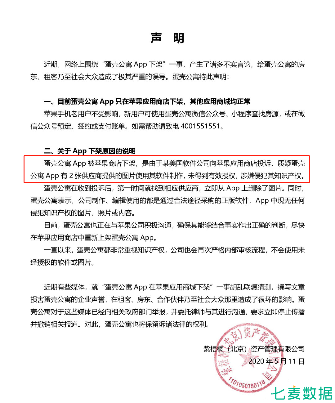 在产品下架后,蛋壳公寓曾于 5 月 10 日对此事进行了官方回应并在次日发布了详细声明,称其下架原因是由于某美国软件公司向苹果应用商店投诉,质疑蛋壳公寓 App 有 2 张供应商提供的图片使用其软件制作,未得到有效授权,涉嫌侵犯其知识产权。