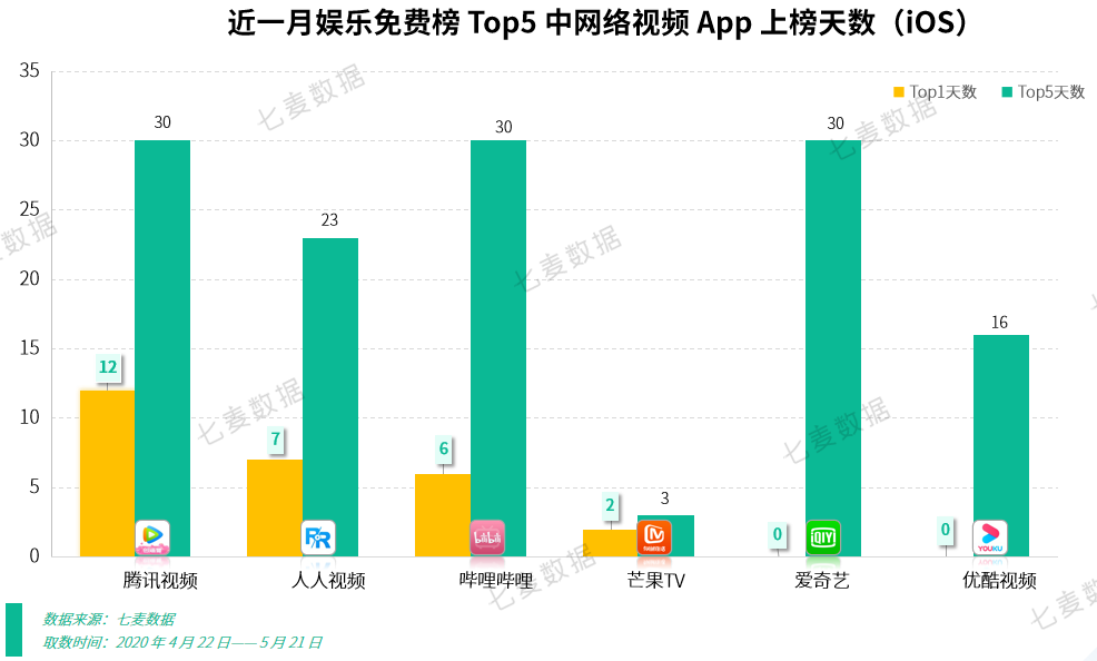 近日,七麦研究院观察到,近一月冲进 App Store 娱乐免费榜 Top5 的产品中,85% 属于网络视频 App。其中,腾讯视频、哔哩哔哩、爱奇艺三款产品整月排名均在 Top5 中,备受关注的西瓜视频排名止步于 Top6,并未上榜;腾讯视频、人人视频、哔哩哔哩、芒果TV 四款产品都曾冲上 Top1,累计霸榜 27 天,成绩十分亮眼。