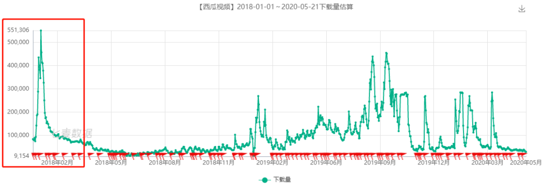 2018 年开始,西瓜视频成为字节跳动强推的产品之一,借助直播答题火热之际,字节跳动以西瓜视频为中心推出系列答题活动,砸钱吸引用户到来。七麦研究院观察到,2018 年年初,西瓜视频 iOS 单日预估下载量曾高达 55w+。