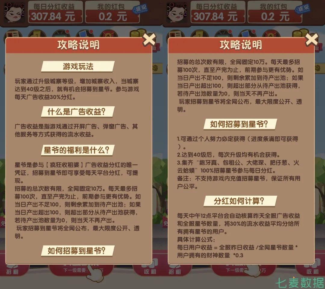 值得一提的是,在游戏级别达到 40 级的时候,用户所扮演的收租婆就有机会招募到星爷,参与游戏的广告收益分红,这也促使许多用户为了招募到星爷而不断使用游戏,促进了产品的活跃度。