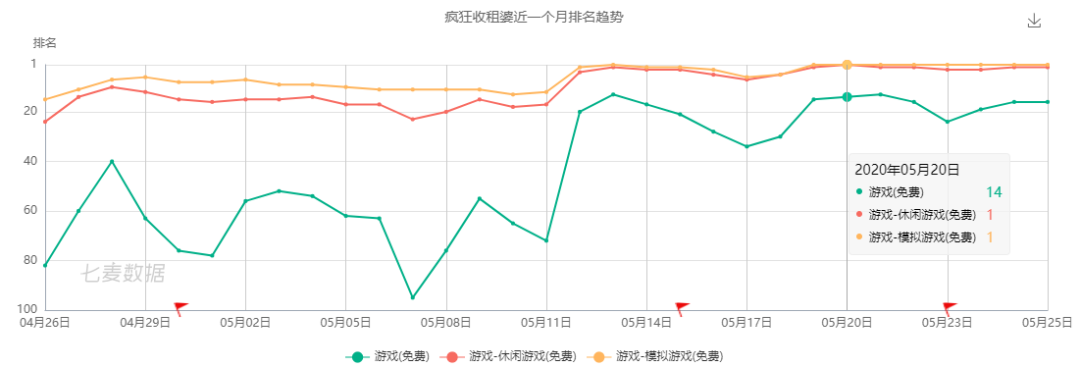 通过产品用包租婆这一经典形象,使产品富有趣味,另一方面则利用广告投放的流量加持,使产品在近期的预估下载量不断攀升,其榜单排名也迅速上升,并在上周连续 6 天占据模拟游戏免费榜 Top1。