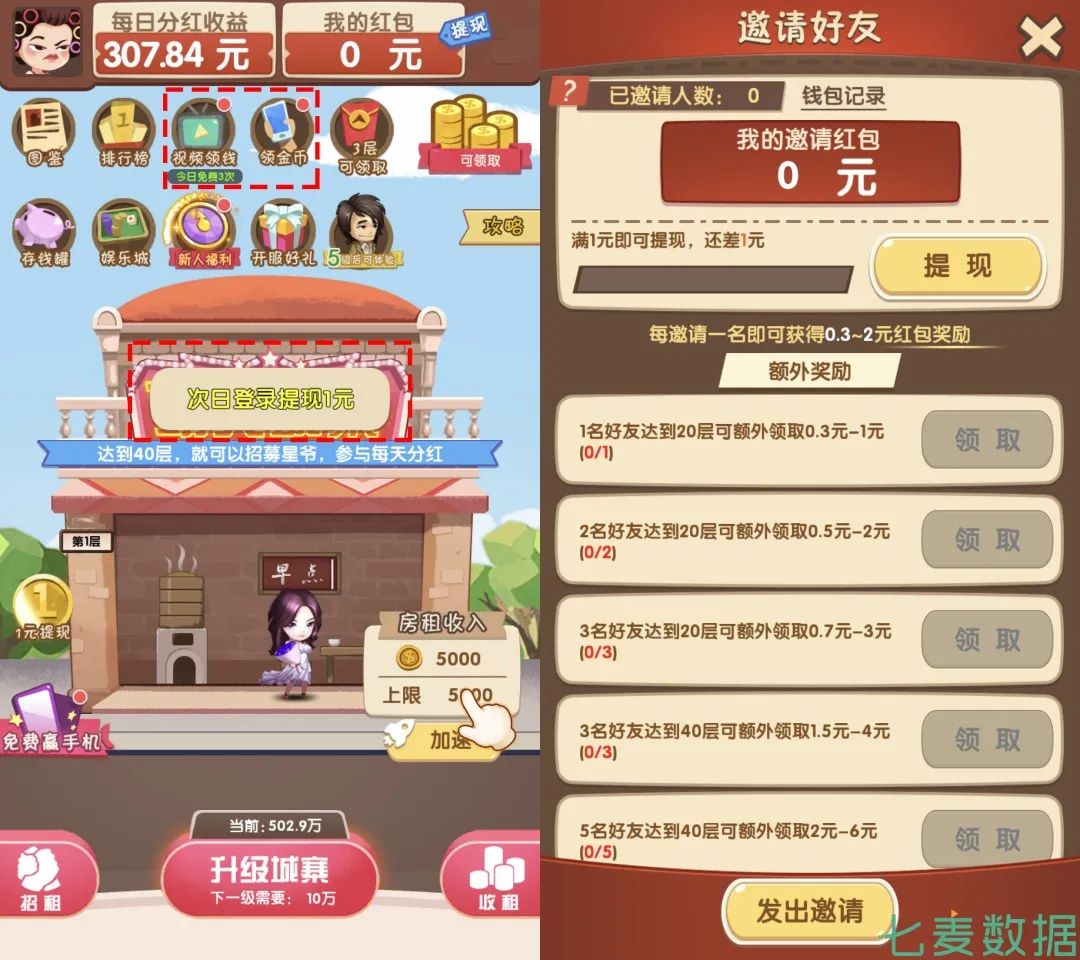 在「疯狂收租婆」中,游戏也加入了网赚的模式,采用让用户邀请新好友、观看广告视频获得金币奖励,从而兑换现金的方式激励用户不断使用产品。