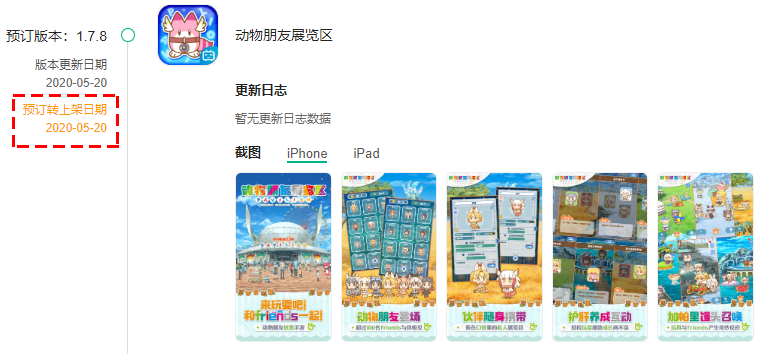 根据「动物朋友展览区」的版本记录显示,该游戏是在 5 月 20 日由预订转上架,通过预订的方式,使产品在正式上架前,就可以获得一定的 App Store 曝光,从而达到积累用户的作用。
