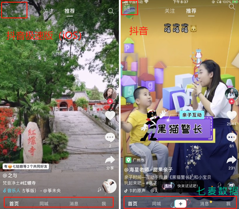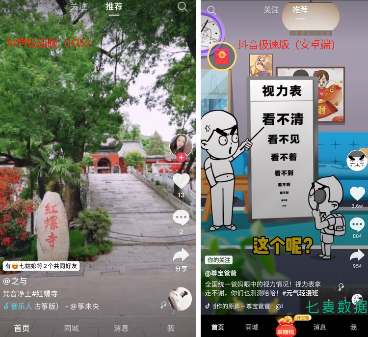 此外,七麦研究院在观察、分析这款抖音极速版时,发现以往在抖音当中时不时会出现的信息流广告、游戏链接等等,在这款产品当中也并未出现,展示的都是最简单的短视频,而且也没有广告以短视频展示的情况出现。