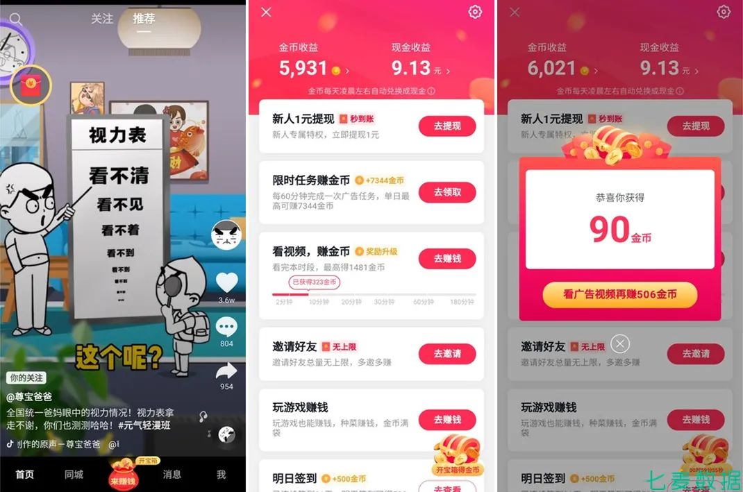 产品界面最下方的 C位上,是一个大大的红包,上面写着“来赚钱”,点击后会跳转到,这款抖音极速版的任务界面,看视频、限时做广告任务、无上限邀请好友、玩游戏等等,在产品当中全都可以用来赚金币。