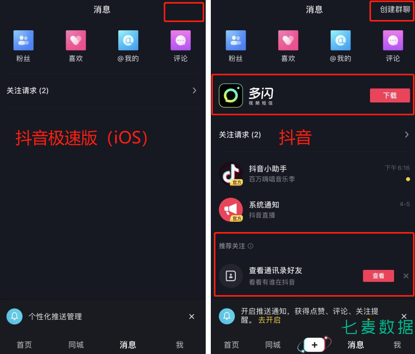 同时,在“消息”界面当中,这款抖音极速版要比主体产品抖音更加简洁,没有抖音如今正在大力“抖音好友 App”多闪的下载界面,以及也没有创建群聊、自动推荐的好友关注、申请查看通讯录等功能。
