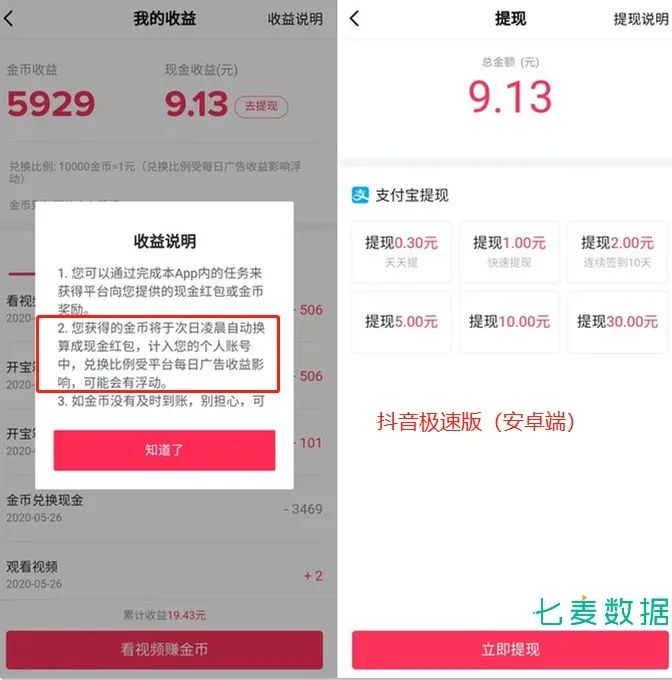 用户做任务后的金币收益,将会在次日凌晨自动换成现金红包,1w 金币约可兑换 1 元现金。与其他网赚产品相比,自动换现的功能要更为方便,且抖音极速版的提现小额度的设置,也更加人性化。