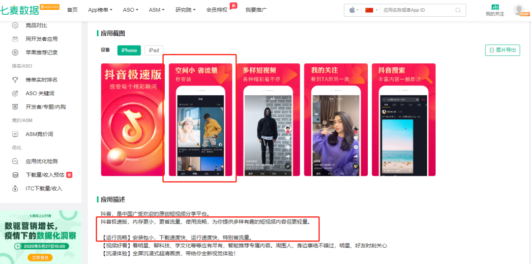 从 App Store 产品详情页中,可看到这款抖音极速版的应用描述中,写到:抖音极速版,内存更小,更省流量,使用流畅,为你提供多样有趣的短视频内容但更轻量。同时,在应用截图当中,也出现了空间小、省流量、秒安装等描述同样功能的字样。