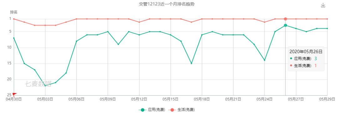 对交通道路的违法行为处理增多,也带动了垂直产品「交管12123」的用户使用频率,使其在近期频繁登上生活免费榜 Top1,并稳定徘徊在应用免费榜 Top10 以内。