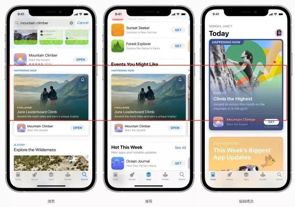 除了 App 的详情页,App 内活动还可以直接显示在搜索结果中、“Today”、“游戏”和“应用”标签的编辑选荐和个性化推荐中。