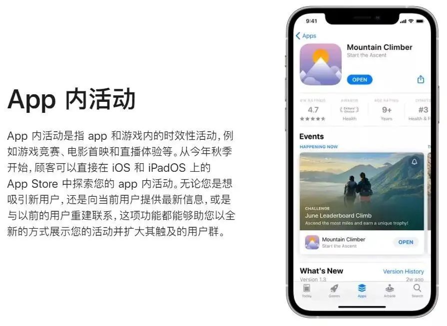 App 内活动是指应用和游戏内的“时效性活动”,所谓“时效性活动”,苹果解释说*是当前或者即将发布的重大活动,例如游戏竞赛、新电影首映、直播体验等。