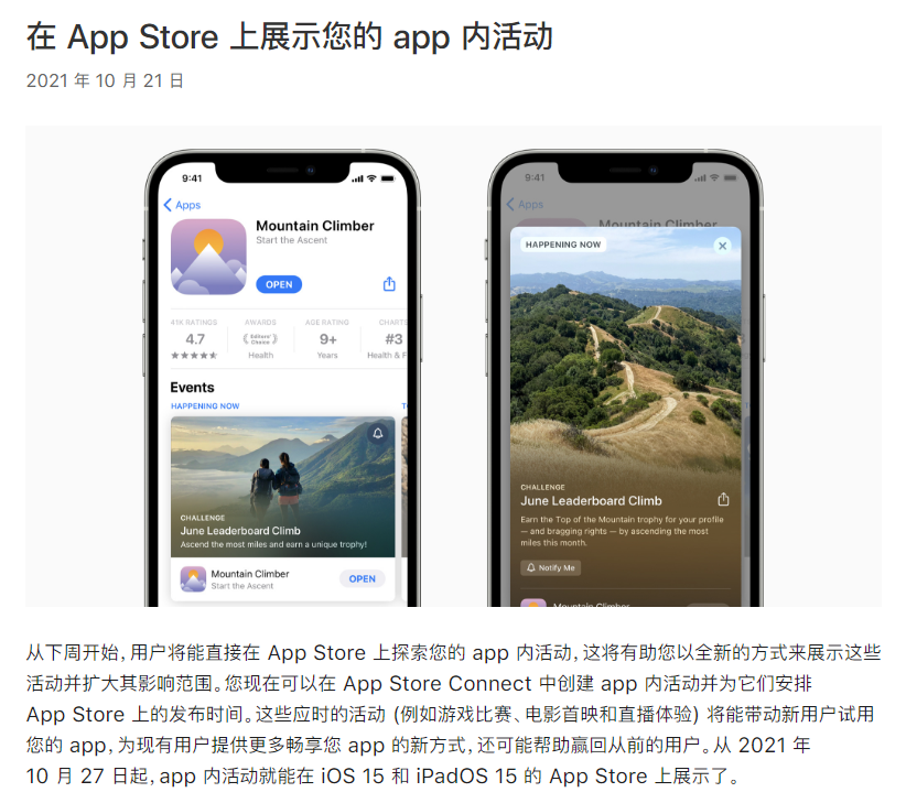 今天,苹果正式通知开发者:【App内活动】即日起可以提交审核,下周也就是10月27日即可在iOS15系统的App Store内展示了!
