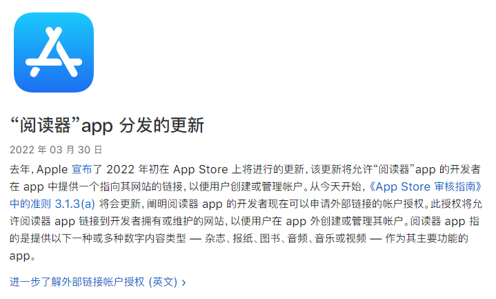 3月30日,苹果发布一则更新通知:“将允许‘阅读器’App 的开发者在 App 中提供一个指向其网站的链接,以便用户创建或管理帐户”。这项内容也将正式在《App Store审核指南》中进行更新。