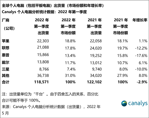 5月7日,Canalys*数据显示,2022 年*季度*个人电脑(包括平板电脑)出货量为1.18亿台,同比下降3%。其中,平板电脑出货量同比下降3% ,为3860万台,而Chromebook笔记本电脑与2021年*季度的创纪录表现相比,下降了60%,跌*490万台。