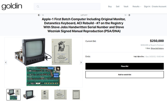 5月7日消息,据 MacRumors 报道,一台罕见的苹果 Apple-1 电脑正在被拍卖,这台电脑的出价已超过25万美元(约 167.25 万元人民币)。