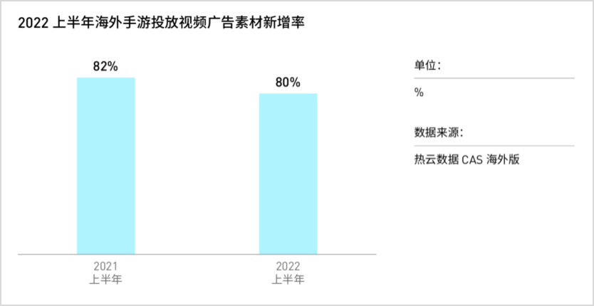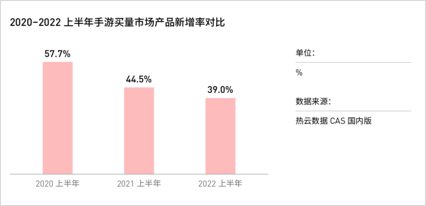 根据热云数据CAS海外版的监测数据,2022上半年海外手游买量市场的总体买量新增率为28%。该数据与去年同期相比有所下滑,不过纵观近两年的数据,2022上半年的新增率仍处于高位。
