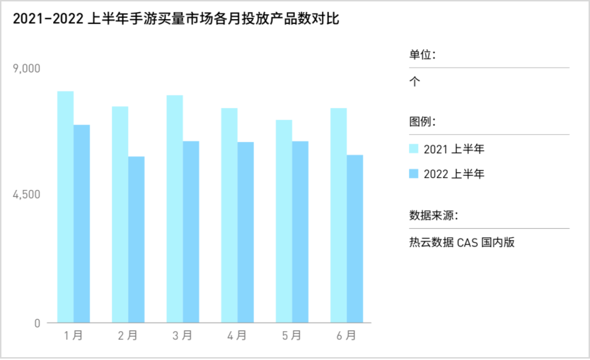 2022上半年,国内手游买量市场整体呈现出疲软态势。根据热云数据C.A.S广告素材智能分析系统数据,今年上半年手游买量市场投放产品数约1.2万个,低于去年同期近20%,这也是近3年来投放产品数的*点。从各月投放产品数上看,今年上半年月均投放产品数约6200个,低于去年同期约1200个。