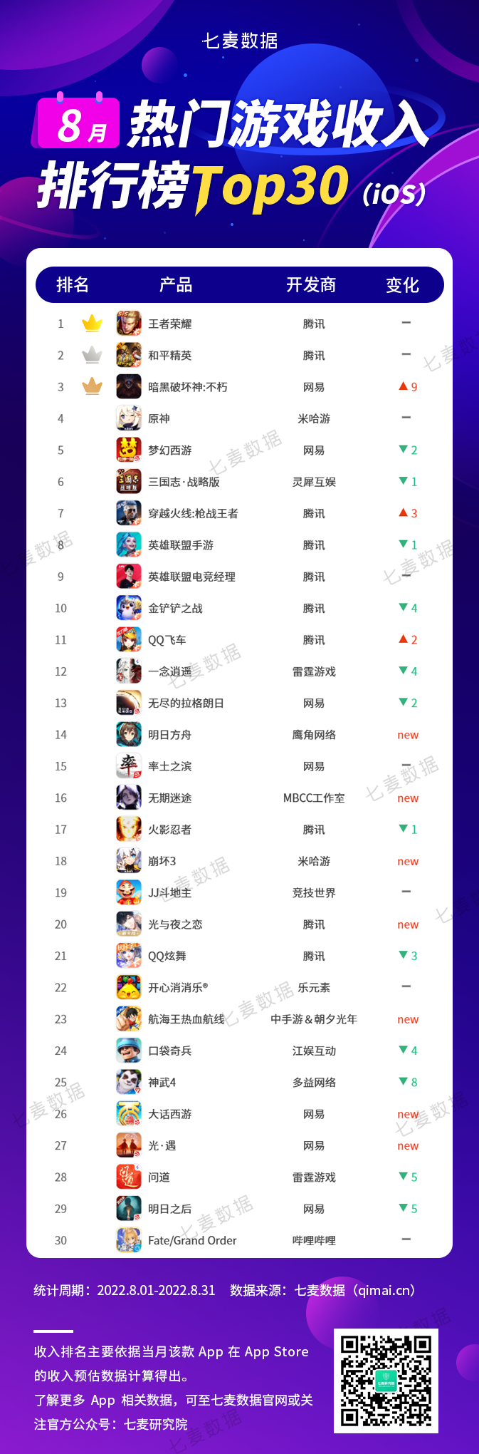 暑期档下半场,收入榜也有显著的变化。热门游戏收入榜 Top3 格局终被打破,排名前两名仍是「王者荣耀」「和平精英」,但第三名却不再固定,上月还处于榜单中游的「暗黑破坏神:不朽」经过一个月吸金实力验证,排名直升 9 位,强势突围。