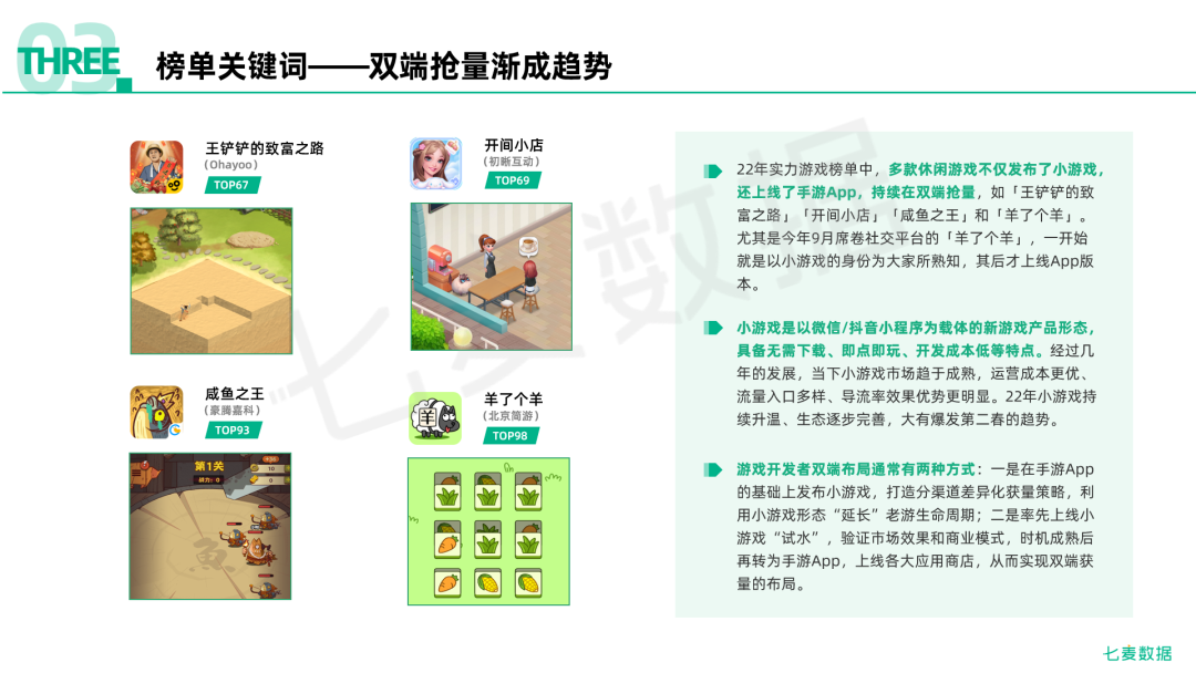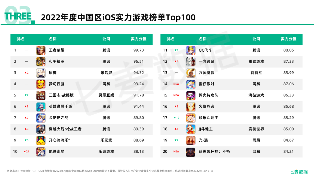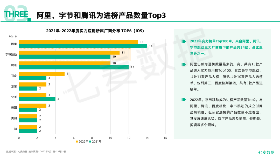 2022年,是充满变化的一年。*经济逆风前行,移动互联网领域的挑战也愈加严峻。2022年,也是在考验中不失生机的一年。在错综复杂的大环境下,新趋势不断迸发:直播电商赛道竞争白热化、云游戏浪潮再起、元宇宙推动VR发展、游戏版号重启、不少企业开启“降本增效”模式......为帮助广大开发者、推广人以及投资者捕获*移动互联网行业的发展趋势,七麦数据依托大数据优势,推出《2022年移动互联网行业白皮书》,此次白皮书的数据样本涵盖了9个应用市场,175个*/地区,1300w+款App,将放眼*,为营销人员揭示移动应用/游戏*的发展态势。1、*智能手机出货量方面,2022年*智能手机市场出货量约2.86亿台,同比下降13.2%,创2013年以来*降幅。其中,苹果手机的出货量为0.48亿,总体表现好于市场整体趋势,成为同比下降幅度最少的品牌,降幅仅为4.4%,所占市场份额也较2021年有所提升。 2、国内在线App数量方面,在线App数量呈下降趋势,截*2022年6月我国国内应用市场在线App数量为232万款,与2021年相比降幅为7.9%(20万款)。3、我国各类别App的用户规模和网民使用率方面,2022年即时通信、网络视频、短视频、网络新闻以及网络直播等五大分类增长较为明显;而受疫情影响,人们出行需求减少,在线旅行预订类App的用户规模大幅度下降。4、在开发者倾向发布的应用商店方面,App Store是大多数优秀的安卓开发者的必选项,安卓应用市场中82.4%的头部App的开发者会同步在App Store上线产品。相对*、公平的生态环境,忠诚度和付费意愿相对较高的用户群体,以及完善的内购分成等机制使App Store吸引着越来越多的开发者。5、*在线App方面,2022年大多数*/地区在线App的数量呈上升状态,应用成为在线App数量整体增长的主力。线上需求场景逐渐多元化并带动多领域App快速发展和上线,同时开发者也逐渐适应了平台的规则,上线App更加积极且有序。6、*App更新频次方面,*App更新活跃率仅为31.24%,未更新的App约占在线App总数的七成。功能单一使App的更新空间较小、App开发迭代成本逐年增加等都成为更新活跃率降低的原因。7、头部App更新频次方面,*头部应用和头部游戏的平均更新次数分别为26.80次/年和17.16次/年,更新频次差距明显;在*大陆地区热门App中,更新最频繁的应用「小红书」一年更新了93次,「口袋奇兵」在2022年更新了108次,成为更新最频繁的游戏。8、*App推荐方面,22年游戏比应用更易登上“推荐位”,其中动作类游戏最受小编青睐。从各*/地区推荐的应用数量中可以看出,22年苹果小编对App的推荐继续参考了相关*/地区的文化特色和市场偏好,如在加拿大、英国等欧美*/地区更偏爱推荐健康健美类App。9、从iOS实力应用榜单Top100来看,摄影与录像类App在经历了两年的爆火后,市场趋于冷静,此次榜单中共有10款产品进榜,进榜数量相比去年有所减少。在进榜的产品中,共有17款App具备直播电商的属性,占比近20%,各大平台加速布局直播电商赛道,竞争进入白热化阶段。元宇宙持续升温,腾讯、百度、字节跳动等互联网巨头纷纷加码布局这一赛道,榜单的部分产品也在今年引入了“元宇宙”相关功能。10、从22年iOS实力游戏榜单Top100来看,动作类仍为大热门,上榜数量达20%,另外,22年模拟类实力手游可谓“大爆发”,该类别游戏取材广泛,制作成本较低,市场竞争相对较小。从游戏厂商来看,头部厂商格局稳定,腾讯、网易进榜的实力手游数量*。在榜的「羊了个羊」等多款休闲游戏不仅发布了小游戏还上线了手游App,实现了双端布局抢量。尽管云游戏行业增速放缓,但随着「云·原神」在国内市场的成功,其成功经验势必会吸引其他游戏厂商加速布局,云游戏的渗透率也将得到进一步提升。