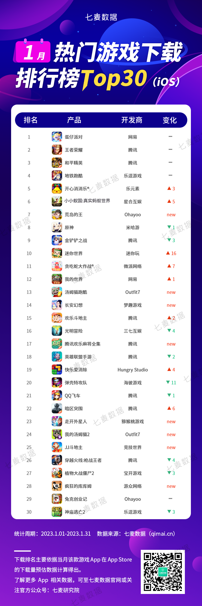 近日,七麦数据发布了 2023 年 1 月热门游戏排行榜,包含游戏下载榜和游戏收入榜。春节档手游之战已尘埃落定,我们一起看看有哪些游戏成功突出重围。
