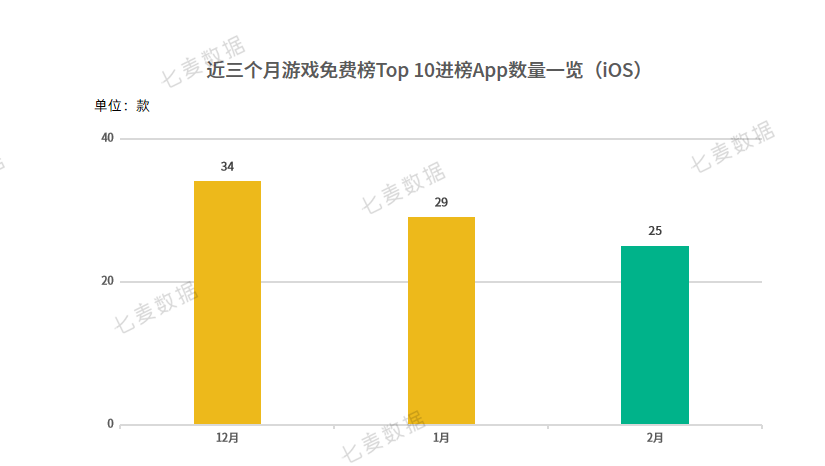 2 月共有 25 款游戏进入过App Store游戏免费榜 Top 10,进榜 App 的数量较上月减少了 4 款。