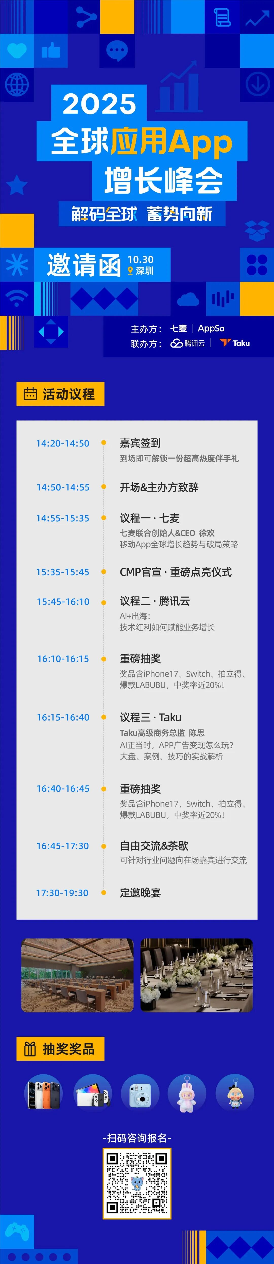 为助力更多开发者和厂商精准把脉行业发展新方向,探索 App *增长新范式,并前瞻 2026 年增长新机遇,七麦 × AppSa 将于 10 月 30 日携手腾讯云、Taku 在深圳特别举办一场线下峰会—— 2025 *应用 App 增长峰会。本次峰会将以“解码*,蓄势向新”为主题,全面聚焦应用品类,通过前沿趋势解读与实战策略分享,全链路打通 App 营销获客、增收提效等关键路径。