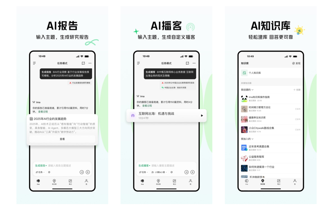 腾讯旗下「ima」移动端自2025年2月正式发布后迅速引发行业内的关注。在信息爆炸、知识碎片化问题日益凸显的当下,用户普遍面临着海量信息筛选效率低、知识转化难等痛点,「ima」则凭借“搜-读-写”全链路赋能,精准解决了用户在信息检索、内容处理与成果输出等环节的核心需求。2025年10月,「ima」更新2.0版本。新版本新增了以Agent能力为基础的“任务模式”,以及知识库“AI要点”等功能。升级后的「ima」可通过智能体实现自主规划,以“任务模式”实现报告、播客生成等。
