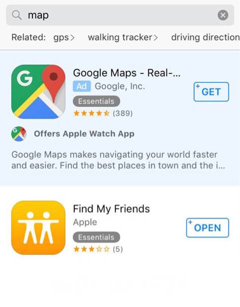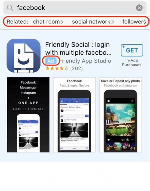 App 的 icon 右下角会有一个“Ad”,为广告标识。另外,该 App 的展示位是蓝色的背景,与其他搜索结果区分开来。